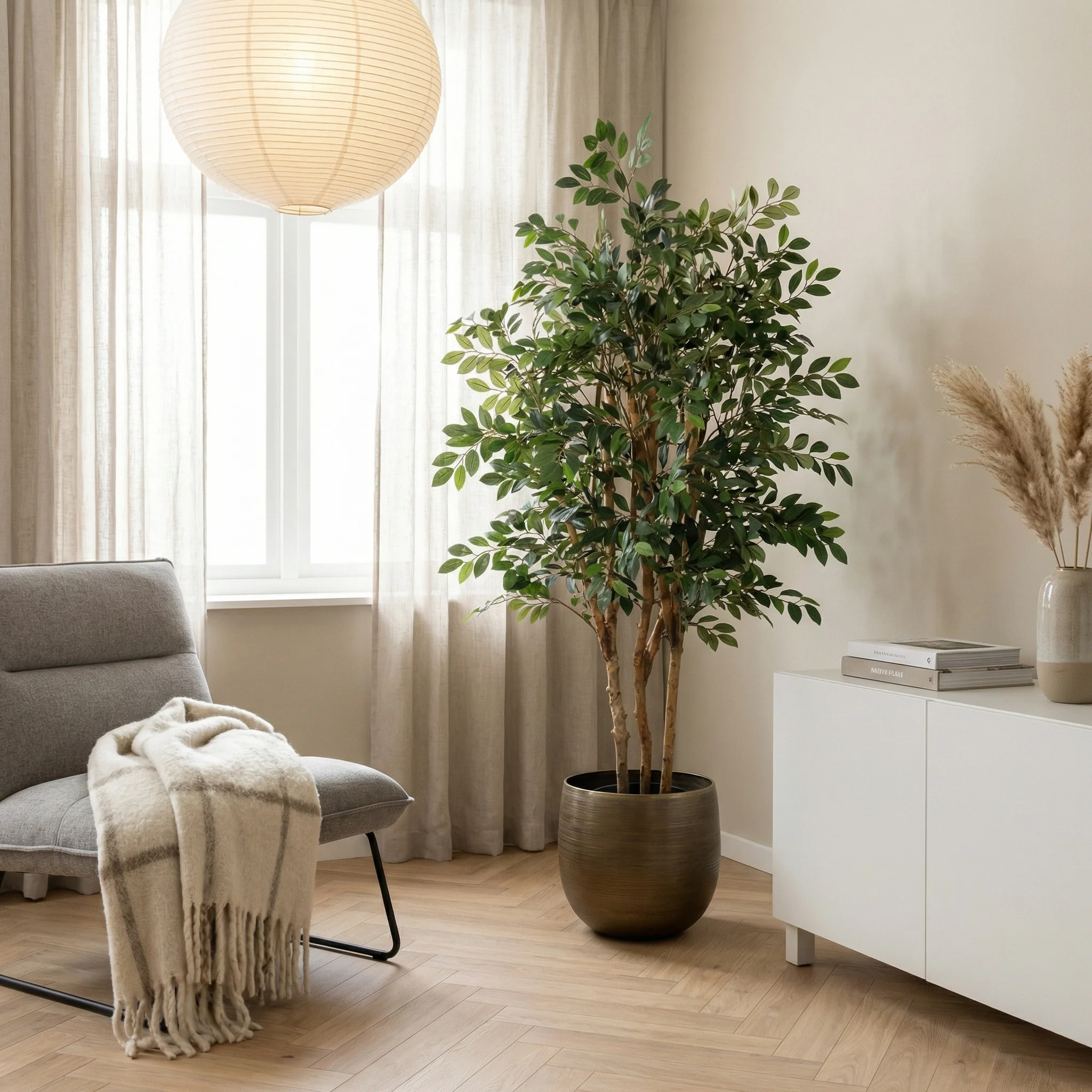 Met zijn hoogte van 150cm is deze kunstplant een veelzijdige keuze voor uiteenlopende ruimtes. Denk aan de woonkamer, slaapkamer, hal of kantoor. Ook op plekken waar een echte plant het lastig heeft; zoals ruimtes zonder daglicht of met wisselende temperaturen, komt de kunst Ficus goed tot zijn recht. Bovendien is hij volledig veilig voor kinderen en huisdieren.
