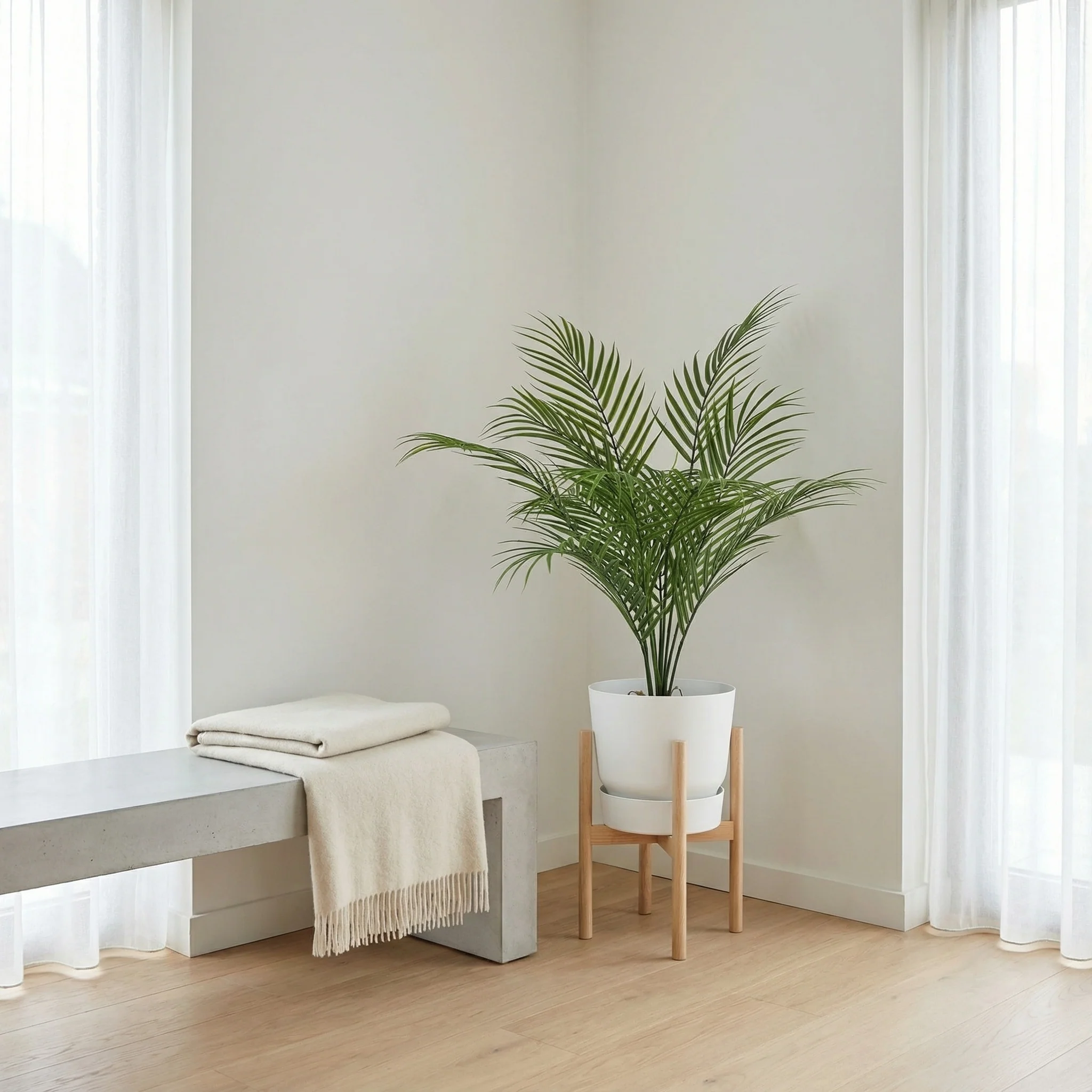 Omdat hij geen licht of water nodig heeft, kun je hem moeiteloos neerzetten op plekken waar een echte palm het moeilijk zou hebben, zoals donkere hoeken of tochtige ruimtes. Bovendien is hij volledig veilig voor kinderen en huisdieren, en dus geschikt voor elk interieur.