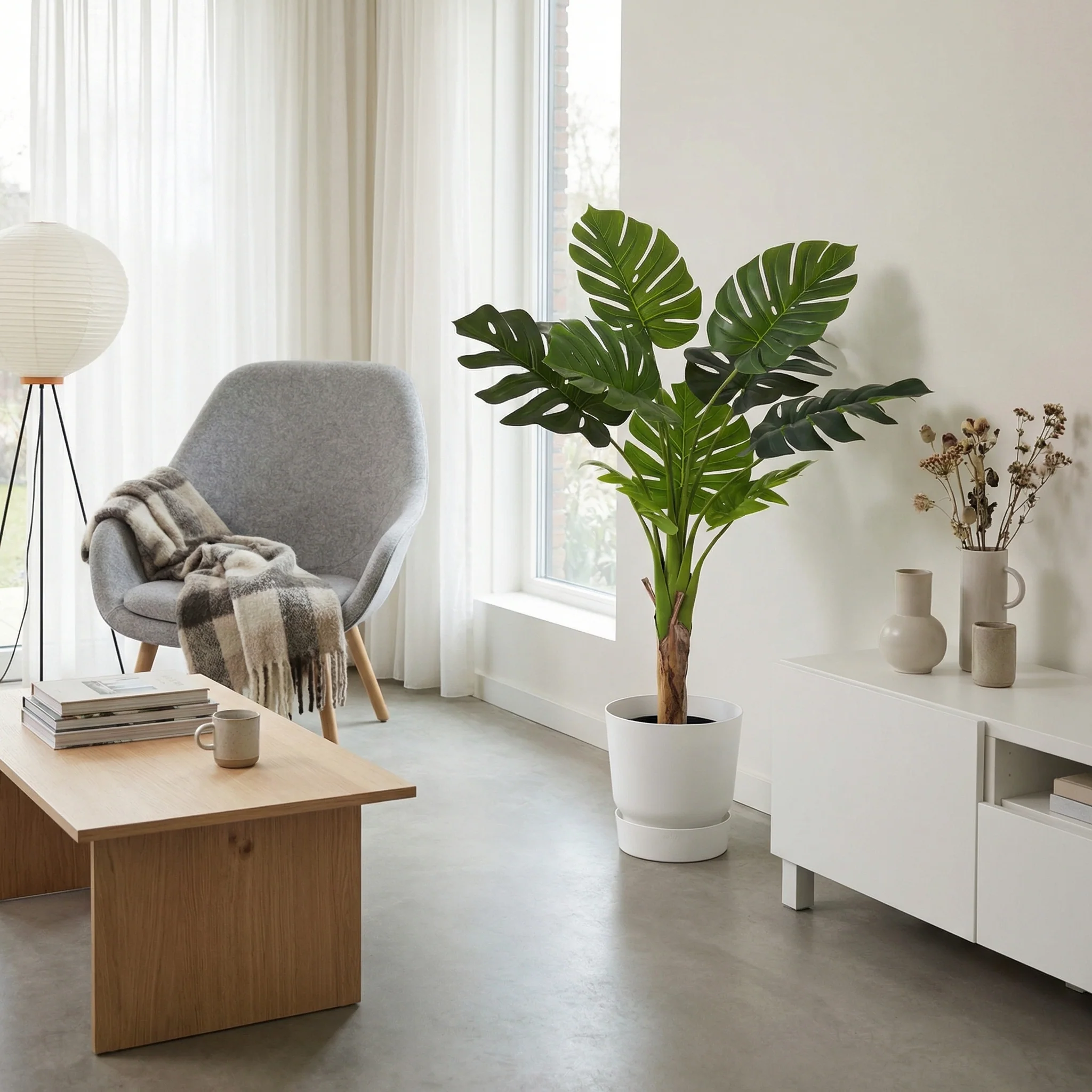 De echte Monstera is populair door zijn grote, opvallende bladeren, maar heeft best wat verzorging nodig. Deze kunstvariant ziet er net zo mooi uit, maar is helemaal onderhoudsvrij. De bladeren zijn levensecht nagemaakt, en de plant blijft het hele jaar door vol en groen, zonder bruine randen of bladval.