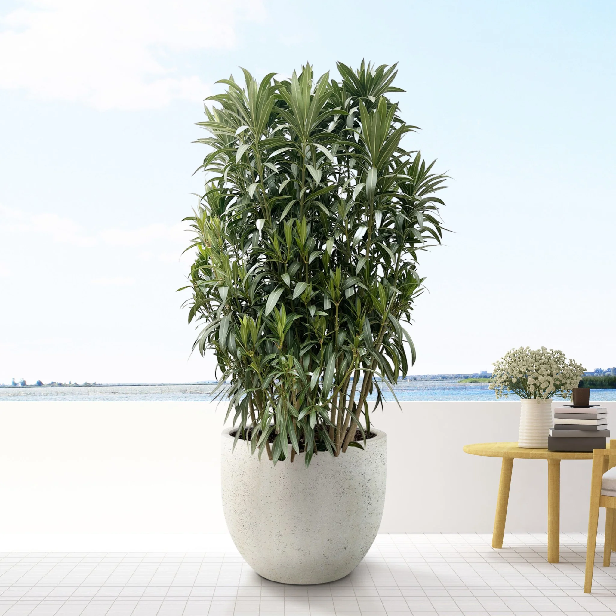 De Nerium Oleander is een grote plant en geeft direct een tropische sfeer aan jouw tuin! Hij staat eigenlijk beter bekend als Oleander. De Nerium Oleander heeft een hoogte van 210 cm, maar kan met de juiste verzorging en voldoende zonlicht doorgroeien tot 240cm hoogte. Deze sierlijke buitenplant behoort tot de maagdenpalmen familie.
