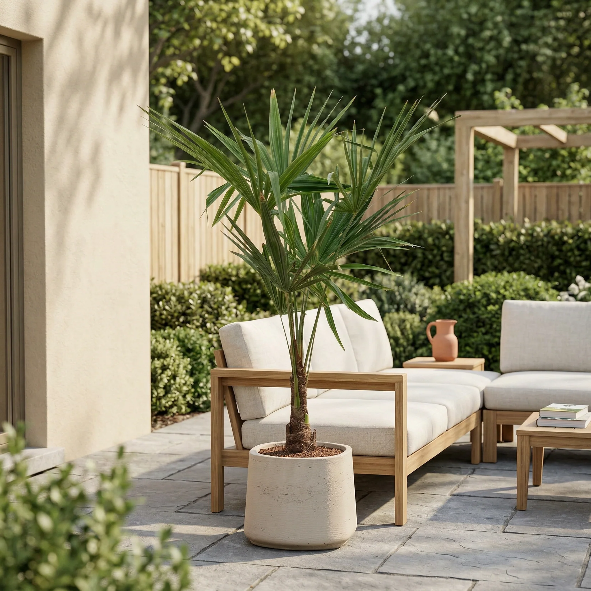 De Trachycarpus heeft de meeste zon nodig en kan buiten in direct zonlicht staan. Kies een plek uit de wind en tocht om beschadiging van de bladeren te voorkomen. Deze winterharde palm overleeft temperaturen tot -18°C, maar we raden aan om de palm bij zulke kou binnen te halen of te beschermen met een winterhoes