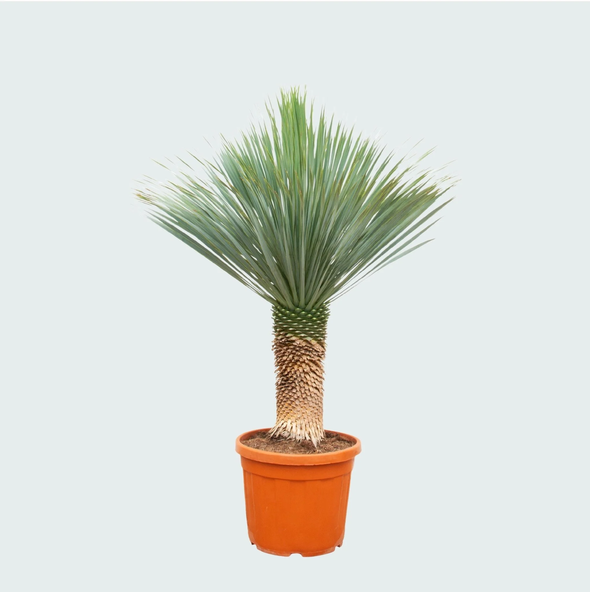De Yucca Rostrata is een bijzondere verschijning vanwege zijn unieke vorm. De kroon met daarin lange, heldergroene, grote bladeren van zo’n 40 tot 60 centimeter die recht omhoog staan maakt de Yucca Rostrata een echte eye-catcher. Deze bladeren groeien vanaf de binnenkant naar buiten. Wanneer de buitenste bladeren hun beste tijd hebben gehad kan je ze laten hangen voor een natuurlijk effect maar je kunt deze ook afknippen waardoor je een mooi strak effect creëert. Oorspronkelijk komt de Yucca Rostrata uit Noordoost-Mexico, West Texas en de Chihuahua woestijn.