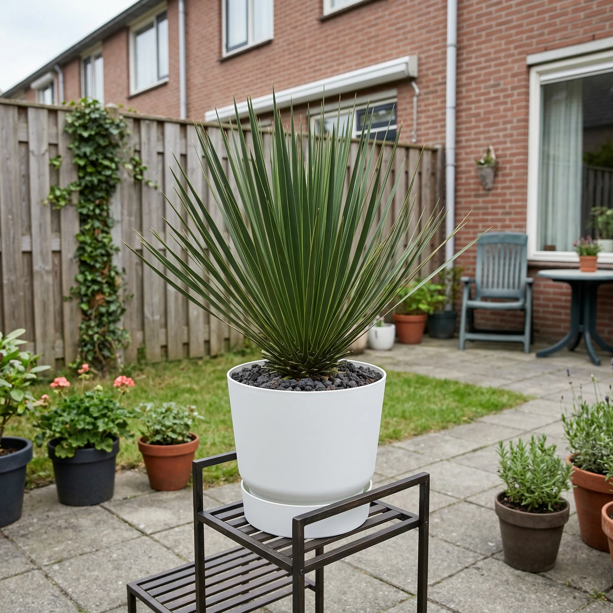 De Yucca is een zonaanbidder die weinig water nodig heeft. In de winter kan de Yucca Rostrata gevoelig zijn voor vocht. Zorg voor goede drainage in de pot en bescherm de plant in de natte maanden tegen overtollig vocht om rotting te voorkomen.